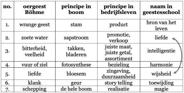 Daarna volgen de drie krachten van het tweede principe, het Licht. De vijfde oergeest is de liefde, de verborgen bron die het lichaam niet vormt, maar innerlijk doordringt. Wanneer deze liefde zich in het lichaam uitleeft, komt het geheel tot bloei. De zesde oergeest is klank of toon, waardoor alles uitdrukking en onderscheid krijgt. De zevende oergeest is de allesomvattende gestalte, de natuur zelf, waarin alle krachten samenkomen en waarin de schepping concreet wordt.